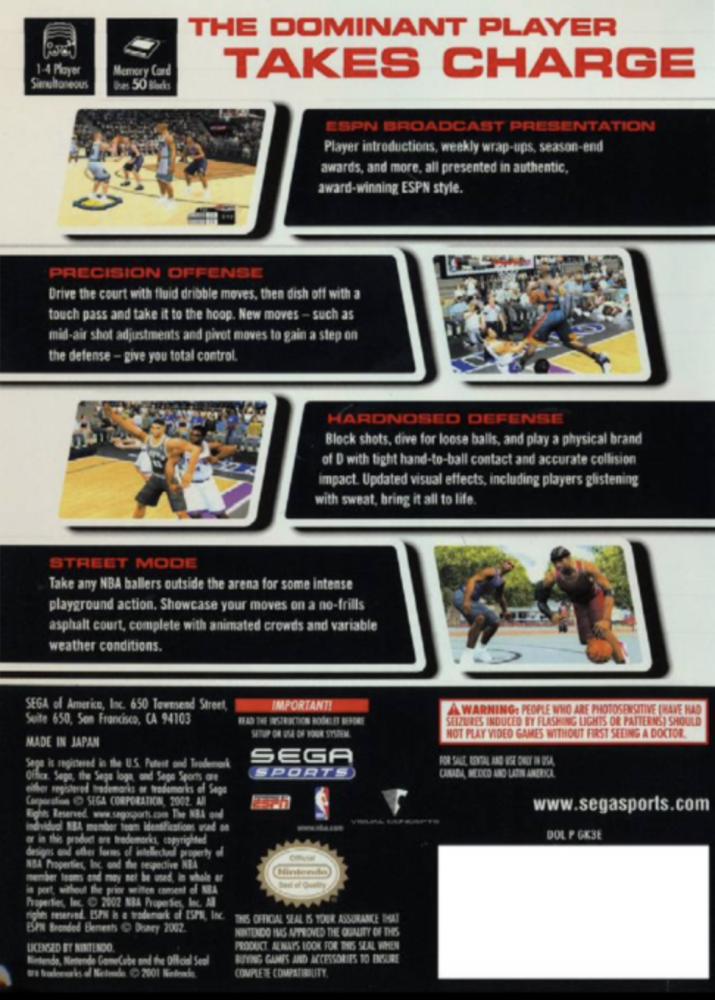 Sega Sports™ NBA 2K3 powers forward with the kind of improvements that only results from an off-season dedicated to perfection. Imagine jump shots so real players actually adjust their movement in mid-air, based on distance from the hoop and defensive pressure; a passing touch that gives you the control to skirt a defender or air-out a fast break; dribble moves that let you jab left, rock right, crossover, and spin; and much more. It's all happening in NBA 2K3.