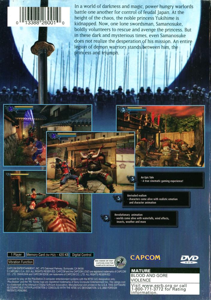 As power-hungry warlords battle one another for control of feudal Japan, a young princess is kidnapped. Now, one lone swordsman, Samanosuke, boldly volunteers to rescue and avenge her. An entire legion of demon warriors stands between you and the princess, so you'll need all your weapons and magic to break through. The world of Onimusha: Warlords comes alive with waterfalls, wind effects, insects, and weather, but in order to triumph, you must stay focused on your mission.