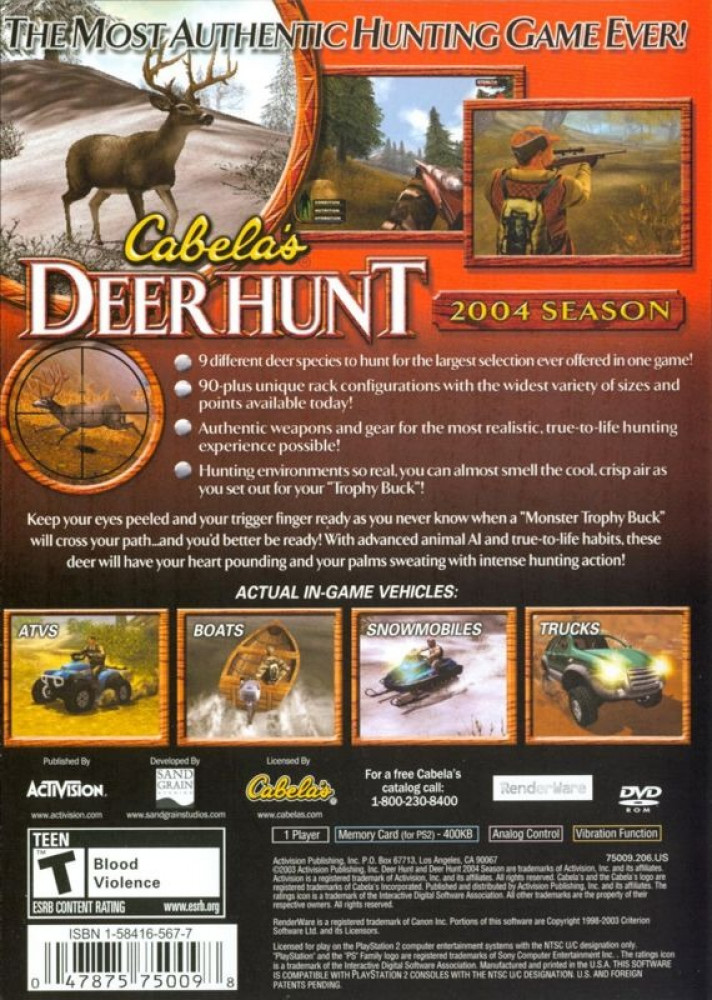 Experience fast paced hunting action in pursuit of trophy bucks in 24 states and provinces across North America. Cabela's Trophy Bucks starts you at the most critical and exciting part of each mission where you will be immediately presented with a challenge. You will hunt 11 species of trophy deer including Whitetail, Rocky Mountain Mule Deer, Sitka, Desert Mule Deer, Columbian Black Tail and more.