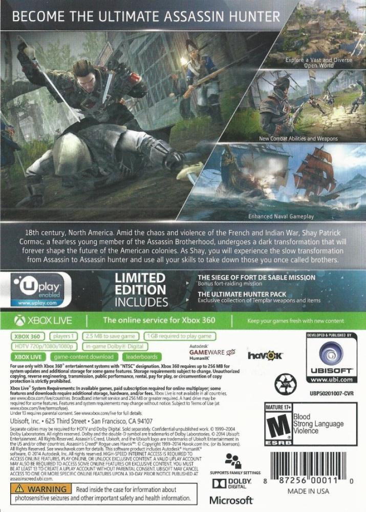 Introducing Assassins Creed Rogue, the darkest chapter in the Assassins Creed franchise yet. As Shay, you will experience the slow transformation from Assassin to Assassin hunter. Follow your own creed and set off on an extraordinary journey through New York City, the wild river valley, and far away to the icy cold waters of the North Atlantic in pursuit of your ultimate goal, to bring down the Assassins.