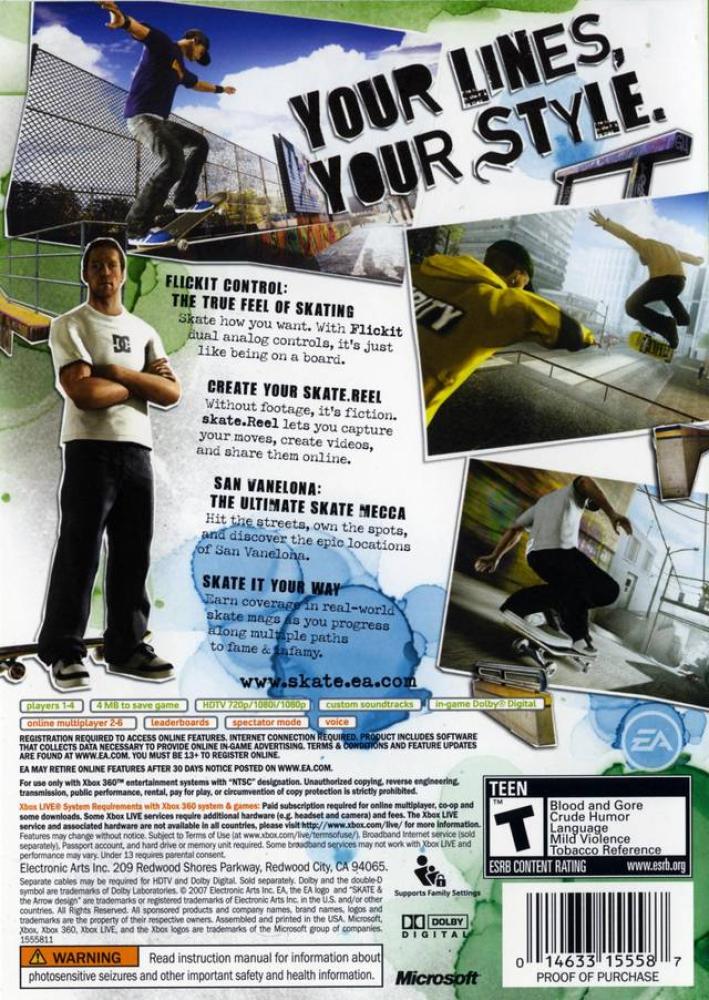 Skate delivers the feel of skating through innovative controls, authentic cameras and a fully reactive skateboarding city. The game features professional skaters such as Danny Way and PJ Ladd, as well as a reactive city and relevant in-game cameras. Skate's unique control scheme captures the true feel of skating versus the typical button mashing gameplay of past skating games.