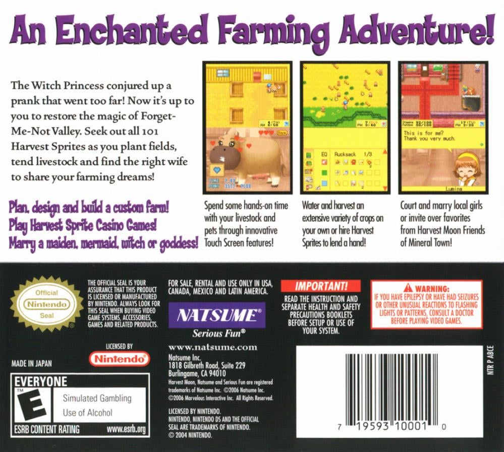 The Nintendo DS installment of Harvest Moon displays the action and interaction sequences on the upper screen while the lower screen serves as an interface with command buttons to point and tap. The bottom screen is also the relay area for messages and conversations. To take advantage of the stylus, Marvelous has programmed "direct" interaction with animals where players may point at cows, sheep, and horses and perform farm chores on them. Those sheep ain't shearing themselves. Gamers who have either GBA version of "Friends of Mineral Town" may plug it in simultaneously with Korobokkle to unlock bonuses.