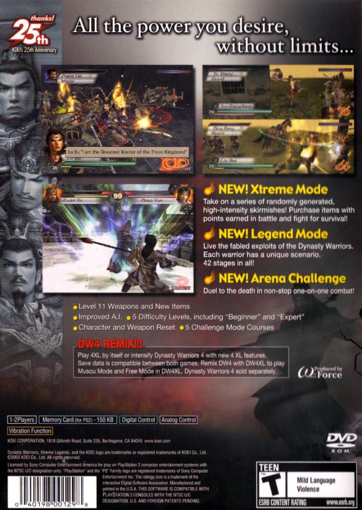 Dynasty Warriors 4: Xtreme Legends includes all 42 characters from the original Dynasty Warriors 4, with new gameplay elements. Engage in randomly generated skirmishes in Xtreme Mode. Live the exploits of all warriors in Legends Mode. Experience endurance-style duels in the Arena Challenge. Play it by itself or in conjunction with the original using Xtreme Legends' disc swap feature. Here's your chance to become a legend among legends.