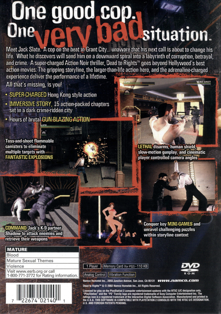 Meet Jack Slate, a cop framed for murder and facing execution. Slate escapes from Iron Point Maximum-Security Penitentiary to bring down the criminals that framed. In Dead to Rights, you play the role of Slate, as he fights through the hard streets and corrupt enemies of Grant City. There are plenty of ways go about bringing the conspirators to justice--Jack can perform disarm moves, shoot different weapons, pick locks, fight hand-to-hand, and play minigames such as arm wrestling, bench press, and dancing. In this gritty, crime-noir inspired epic, you're always on the run.