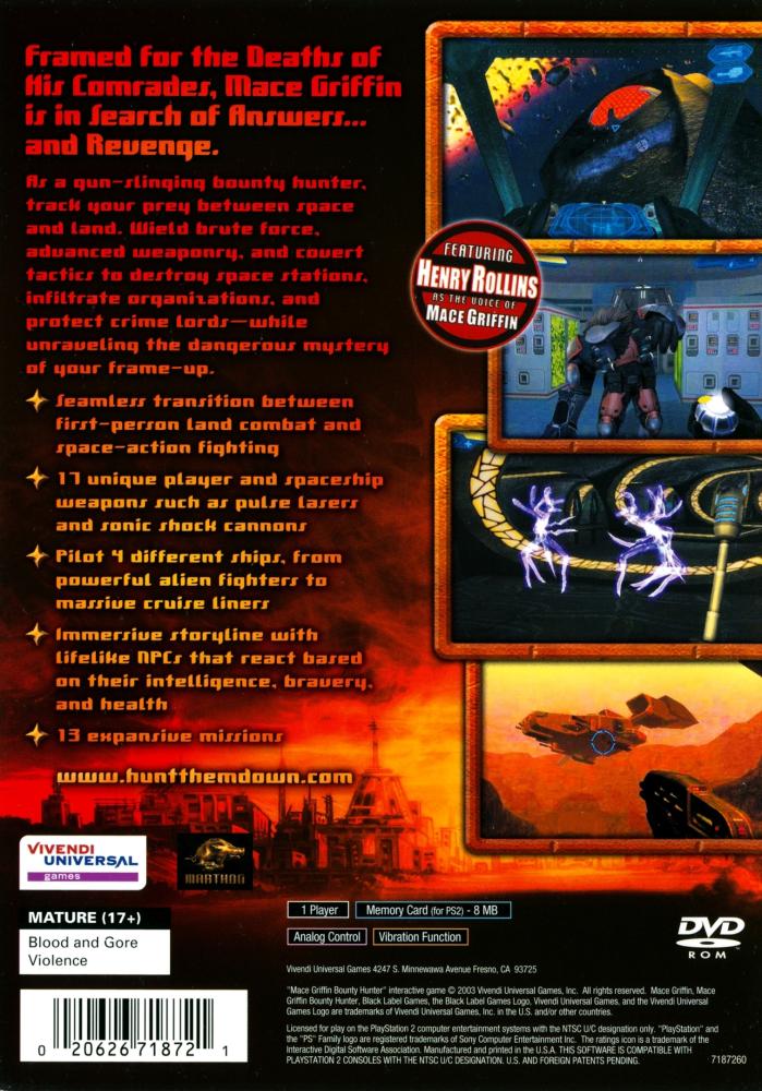 To deal with the rising wave of crime, a new organization emerges--the Guild of Bounty Hunters. As Mace Griffin, you join this group composed of aliens, criminals, and former police as they fight the criminal element. You'll transition between first-person land combat and space-action fighting in 13 expansive missions that offer different challenges and enemies. Eliminate your foes with 17 player and spaceship weapons, including Tridal Nova Cannons, quad-barreled shotguns, and sonic shock cannons. In this universe of large corporations and futuristic gunslingers, you'll unravel a deep and dangerous mystery.
