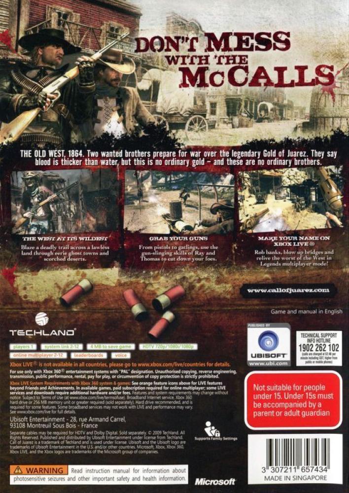Call of Juarez: Bound in Blood transports players from a ravaged Civil War-era Georgia to the Aztec ruins of Mexico. In the wildest West ever depicted, players can embody both McCall brothers in an intense storyline full of greed, lust and lawlessness that takes place during a legendary period of American history. Become a Gunslinger - Harness a variety of weapons from various revolvers to heavy-caliber cannons and machine guns. Every accurate shot increases concentration, which allows players to unleash deadly shooting modes when outnumbered and even deadlier ones when the brothers work together. Dual Collaborative Gameplay - Players choose to embody Ray or Thomas, each with a distinctive gameplay style (close or long range), specific abilities (lasso, dynamite, etc.) and arsenal of deadly weapons (dual guns, long-range carbine, etc.). Take advantage of each of their strengths and join in the fiercest fights imaginable. Never Before Seen Western Experience - Experience the iconic settings full of outlaws - the West before it was tamed. The McCall brothers face a renegade Apache Chief, a greedy Mexican bandit, a vindictive Colonel, and others, all driven by greed with moral disregard. Enjoy a wide variety of situations, using horses, canoes and wagons to explore the vast natural landscapes of the fabled Wild West and its legendary period. Innovative Online Multiplayer - Developed in unison with the single player mode, multiplayer offers numerous modes and maps, resulting in endless hours of Wild West mayhem. Gunslingers, bandits and marshals struggle online for the bounty. Multiple characters are unlocked for team-based objective modes or the straightforward team death match. With a new Bounty system, players increase the bounty on their head with more kills. Get rid of the deadliest among you to increase your bank roll.