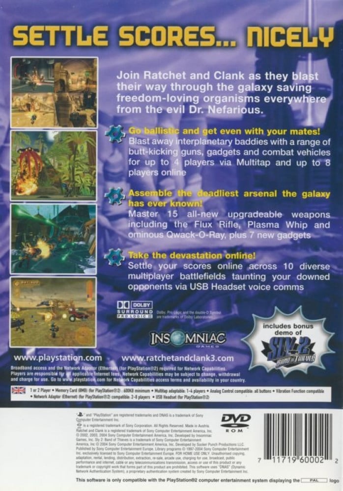 In Ratchet & Clank: Up Your Arsenal, Ratchet and Clank once again team up for an all-new adventure that combines diverse gameplay with elements of action, exploration, adventure, puzzle-solving, strategy, and role-playing into one experience. Together with the Q-Force, Ratchet and Clank set off to uncover the schemes of the sinister Dr. Nefarious and keep the galaxy safe for organic life. As one of three characters, you can now wield new weapons and gadgets, gain access to an array of vehicles, and master all-new abilities. The game also features both single-player and multiplayer (offline and online) gameplay.