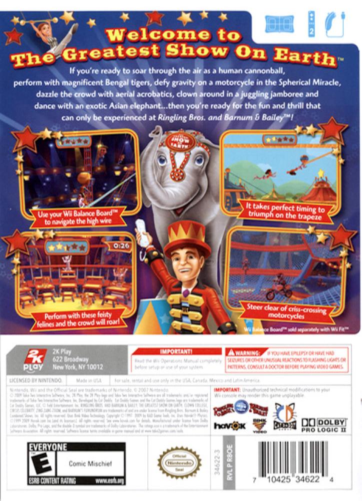 Ringling Bros. and Barnum & Bailey for Wii is an action-oriented party game full of the thrills, excitement and fun that have made the Ringling Bros. and Barnum & Bailey Circus famous for generations. Filled with a combination of interactive acrobatics, sideshow games, animal acts and more, it is designed to deliver both excellent single player and multiplayer action from the comfort of home to circus fans of all ages and experience with the Wii.