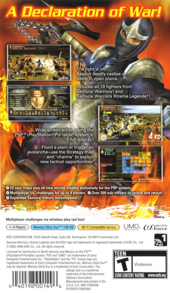 Samurai Warriors: State of War is set in civil war Japan, when great commanders such as Nobunaga Oda, Shingen Takeda, and Kenshin Uesugi struggled for control of the country. Arm yourself with classic Japanese weaponry such as katanas and shuriken, and launch into the chaos of 16th century Japan. The action is relentless, and ranges from massive open-field warfare to sieges of trap-laden castles. With a variety of unique characters, moves, and environments, Samurai Warriors: State of War will give you an unrivalled taste of Japan's most volatile era. Many prominent figures from Japanese history make their appearance in Samurai Warriors: State of War, including the legendary soldier Yukimura Sanada, the revolutionary Nobunaga Oda, and the enigmatic ninja Hattori Hanzo. Each character has signature weapons and skills, as well as their unique role to play in this dramatic epic. State of War's "Battlefield Area System" divides the battlefield into smaller, strategic sections, making the game perfect for quick, portable play. In addition, there are many long-term elements that will keep you coming back for more, such as the raising of character and equipment stats.