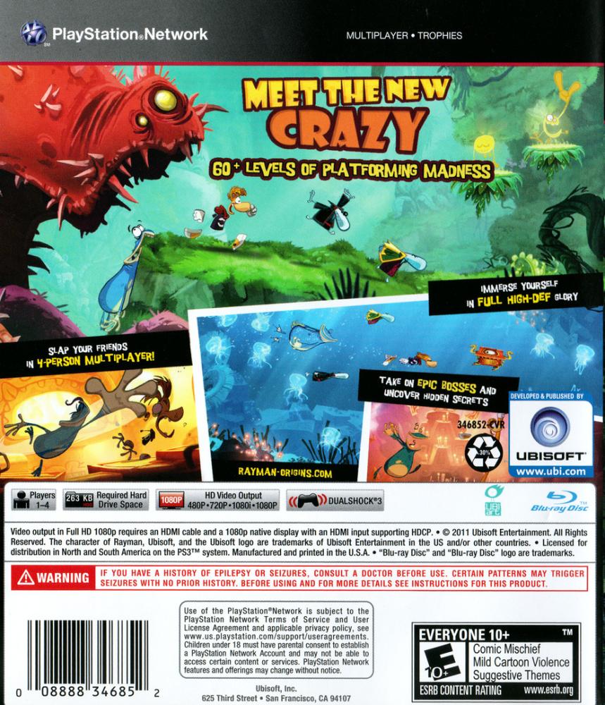 Rayman Origins is a comic adventure set in a lush 2D world brimming with unexpected secrets and outlandish enemies. The Glade of Dreams is overrun by the "nefurrious" Darktoons. The Fairy Council seeks Rayman's help to save the day. Rayman receives the aid of his best friend Globox as well as two crafty wizards, the Teensies. Together the world's most hilarious team of heroes sets out to restore peace to the Glade before their beloved home is destroyed. Rayman Origins supports four-player jump-in-and-jump-out co-op gameplay. The game offers a massive universe to explore, with more than 100 characters, 12 unique worlds, and more than 60 levels of platforming gameplay designed for all ages and play styles. Unlock new abilities and moves as you progress through the game. All members of your team will discover new unique abilities, including swimming, diving, slapping, and the sensational "HarilyCopter."