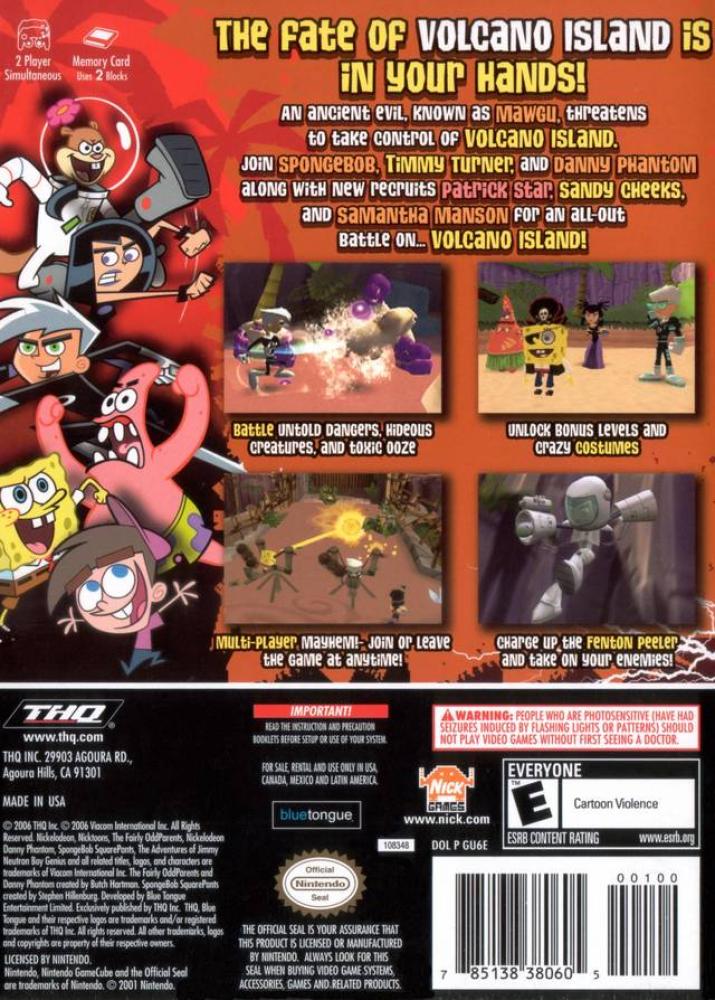 Nicktoons: Battle for Volcano Island is a 3D action platformer game and sequel to Nicktoons Unite! The game combines and links the TV series SpongeBob SquarePants, Danny Phantom and The Fairly OddParents. Jimmy Neutron is not playable this time but does make a cut-scene appearance.