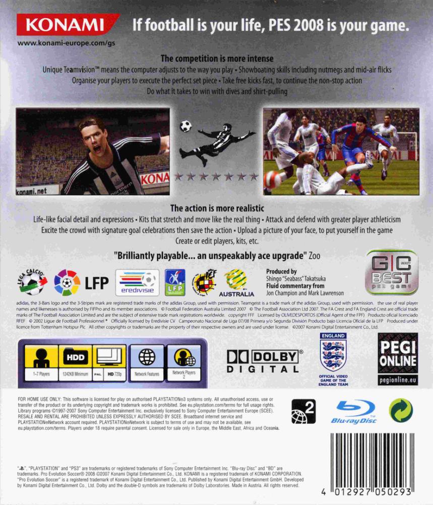 PES 2008 features a brand new intelligence system, called Teamvision, that adapts and reacts to players own gameplay styles to ensure that the computer controlled opponents are always challenging and forcing the player to think and chance their style of play to avoid being out-thought by the game. It learns counter attacks that target your weaknesses and look to exploit any repetitive tactics players use. Defenders react better to danger, closing down the ball and charging at shots and the goalkeepers hold shots that are closer to them as well. Teammates make more intelligent runs into space and the close control has been sharpened to ensure quick and fluid passing and speedy attacks can be built. The next gen versions also feature extensive edit modes so players can completely customise their PES 2008 experience.