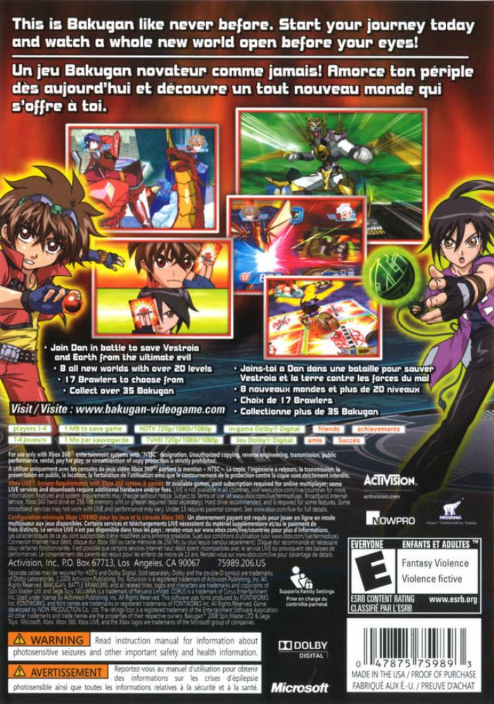 Based on the wildly popular card game and television show, Bakugan: Battle Brawlers, is a video game experience requiring skill, strategy and imagination. Featuring a fierce assortment monsters, uncanny powers and amazing environments in an alternate dimension called Vestroia, the game lets you and your own unique Bakugan join forces with Dan and his fellow Brawlers as they battle to save Vestroia and ultimately, Earth from destruction.