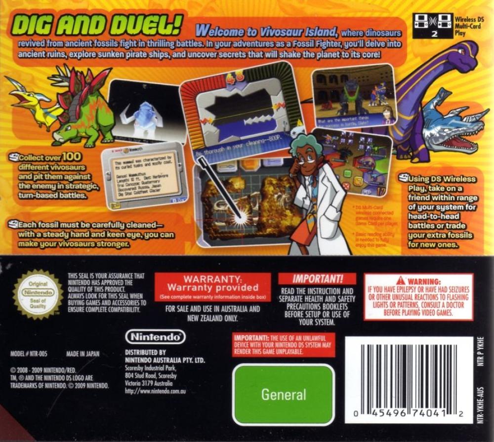 Fossil Fighters invites players to enter a world in which fearsome creatures are hidden as fossils for players to collect, using the unique touch-screen controls of Nintendo DS. Players can clean, collect and battle their discoveries. The game features more than 100 dinosaur-like creatures called Vivosaurs, each of which can be revived and deployed in strategic turn-based battles. With fun tactical elements, vast environments to explore and a lighthearted storyline and characters, Fossil Fighters allows players to control and customize a team of Vivosaurs as they battle their way through the mysterious Vivosaur Island. Players can also connect over local wireless with friends to battle customized teams of Vivosaurs or trade their fossils.