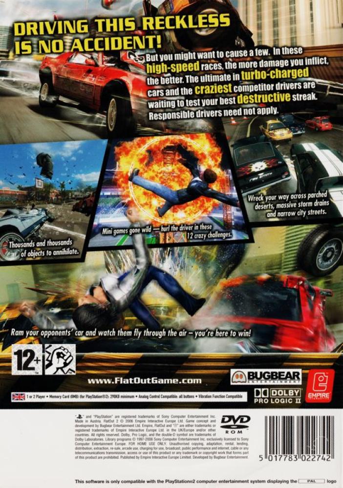 Featuring an enhanced version of the original's physics engine with even faster driving track designs, FlatOut 2 also boasts numerous improvements, enhancements and additions to make the title the definitive FlatOut experience. Twice as many vehicles, a more sophisticated career mode, additional race environments, double the number of tracks, twice as many mini-games along with brand new and much requested online multiplayer modes are just some of the exhaustive features that are included in FlatOut 2. With more than 5,000 fully destructible objects on every track as well as 40 deformable parts on each vehicle, physical interaction in a racing game is taken to unprecedented heights. With a greater emphasis placed on causing destruction on the track by offering greater rewards, game play will be even more frantic than ever. Drivers will need to tear into competitors' cars, trash the local scenery, litter the track with obstacles, while at the same time trying to concentrate on their own race in a bid to cross the line first. The ever-popular Ragdoll mini-games from the original FlatOut game make a welcome return and are better than ever with 12 Ragdoll events, a Ragdoll Championship and full online support. New Ragdoll events include basketball, baseball and royal flush cards.