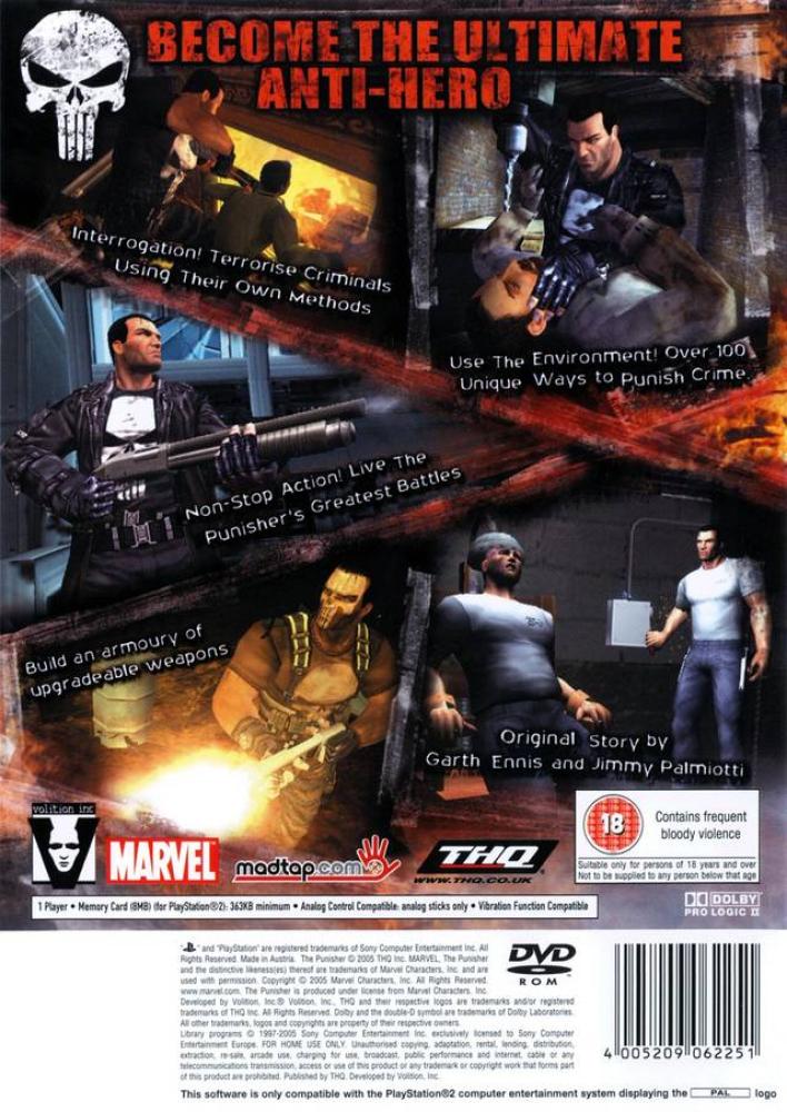 Enter the mind of The Punisher, a vigilante driven by more than just revenge. In a world marked by corruption, you serve as judge, jury, and executioner as you terrorize criminals with their own ruthless methods. Use a combination of physical force and character interaction to coerce criminals into coughing up valuable information, and then put them out of their misery with your arsenal of realistic weapons. The Punisher War Journal lets you relive in-game moments, collect items from Marvel's Punisher history, unlock bonus DVD footage, and more.