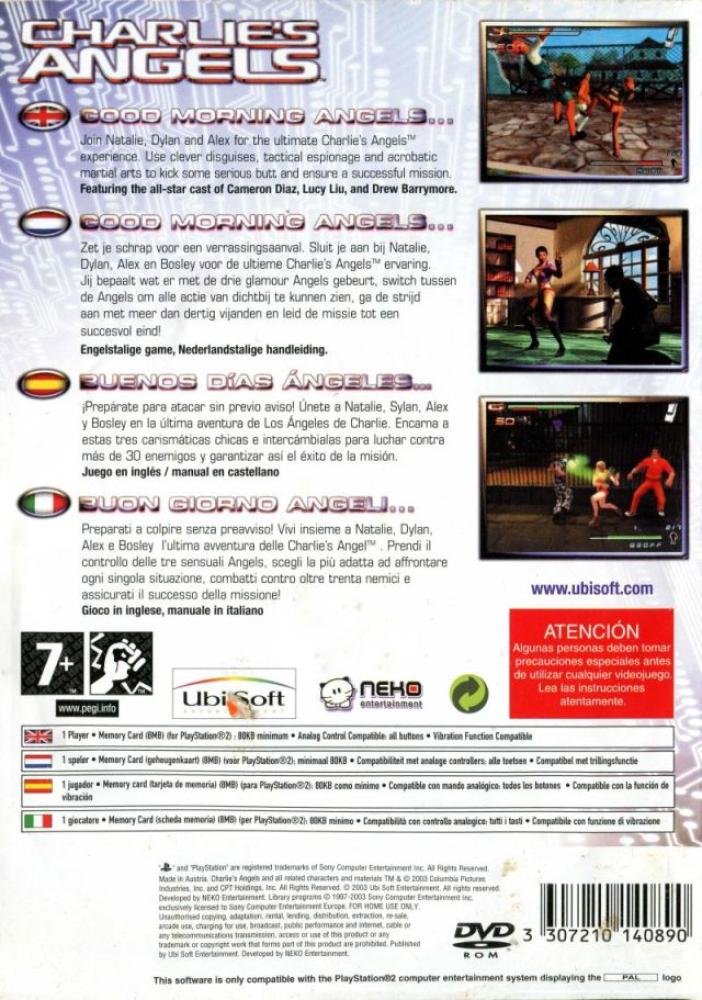 Join Natalie, Dylan, and Alex for an intense adventure based on the Charlie's Angels movies. You'll need various disguises, clever tactics, and acrobatic martial arts moves to ensure a successful mission. Master the different styles of all three Angels as you battle 32 different types of enemies across the globe. You can switch between characters at anytime during the game. Charlie's Angel's movie stars--Cameron Diaz, Lucy Liu, Drew Barrymore, and Bernie Mac--supply the voices.