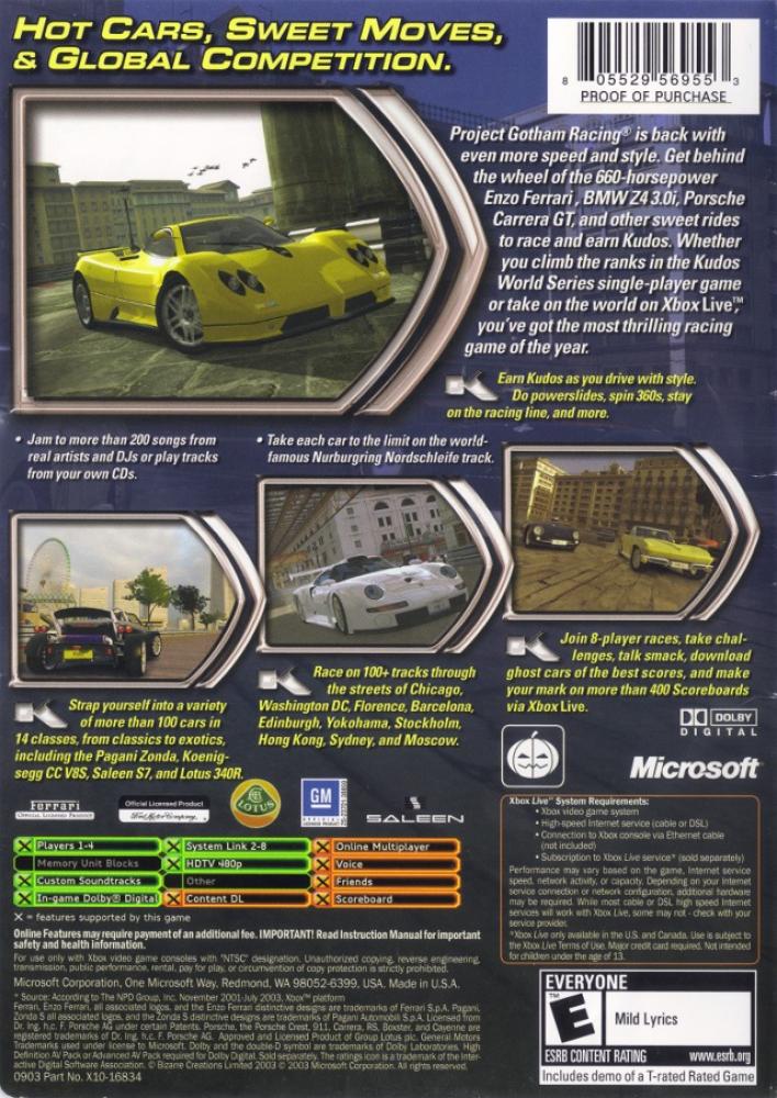 Project Gotham Racing 2 is a true test of racing skill, style, and daring that rewards you not only for how fast you drive, but also for how you drive fast. Earn Kudos and gain recognition for cornering on two wheels around the Sears Tower in Chicago; power-sliding through the ancient streets of Florence, Italy; or maneuvering along the racing line through the slick streets of Edinburgh, Scotland--all while racing some of the most exotic high-performance vehicles available. You can even challenge other gamers online, using Xbox Live, or take on your friends in a multiplayer race via System Link.