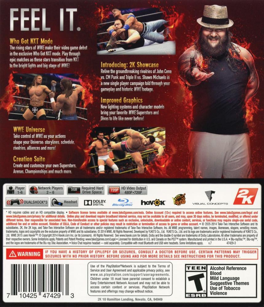 WWE 2K15 ushers in a new era of WWE video games! The first WWE game to be featured on Next-Gen platforms, WWE 2K15 will introduce the hardest hitting and most fluid WWE gameplay to date, closer than ever to what fans see on WWE TV. With significant gameplay enhancements, a presentation overhaul, and all-new MyCAREER and 2K Showcase game modes, WWE 2K15 delivers the most authentic and action-packed WWE video game experience to date. Feel every blow, hear every impact. WWE 2K15. Feel It.