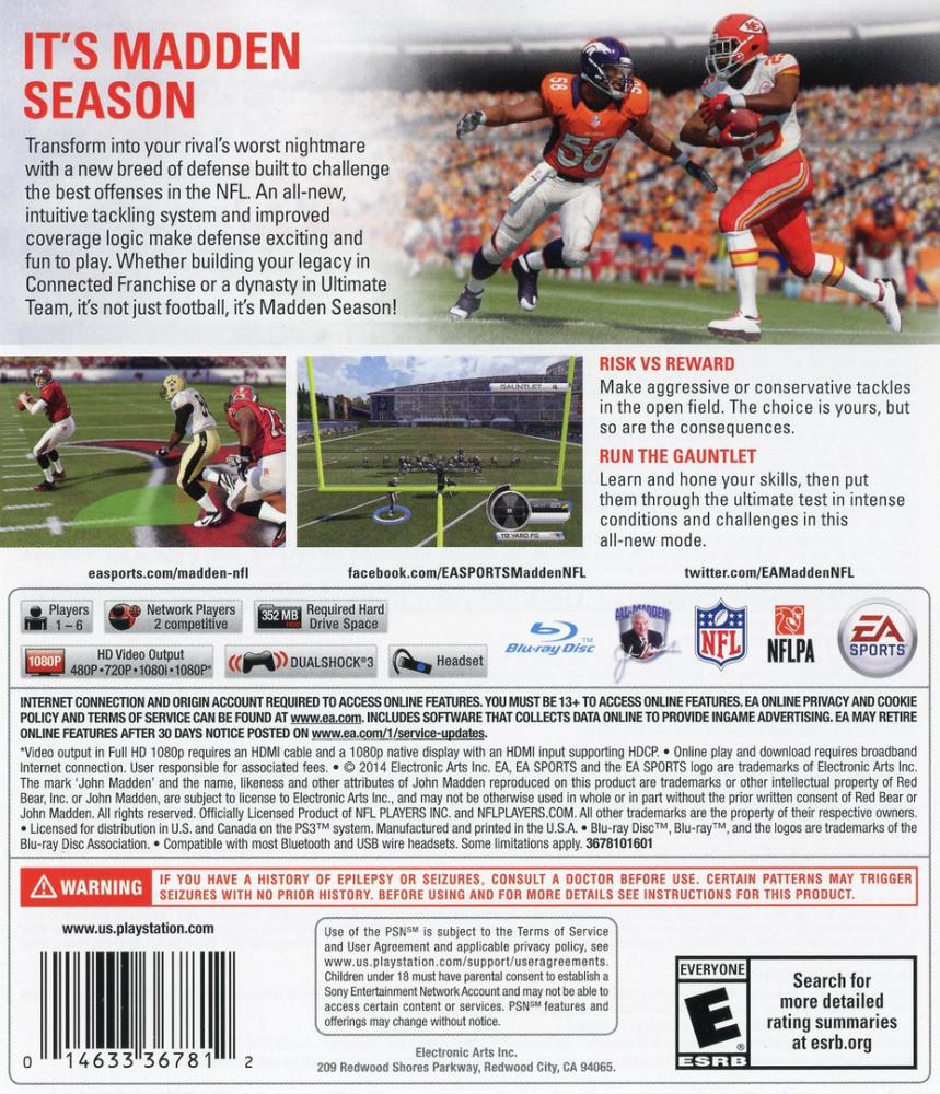 Madden NFL 15 transforms you into your rivals worst nightmare with a new breed of defense built to challenge the best offenses in the NFL. A new arsenal of pass rush moves, an intuitive tackling system, improved coverage logic, and immersive new camera angles make defense exciting and fun to play. Call plays with confidence thanks to an all-new crowd-sourced recommendation engine built from millions of online games played by the Madden community. Add in all-new NFL Films inspired presentation and its not just football, its Madden Season!