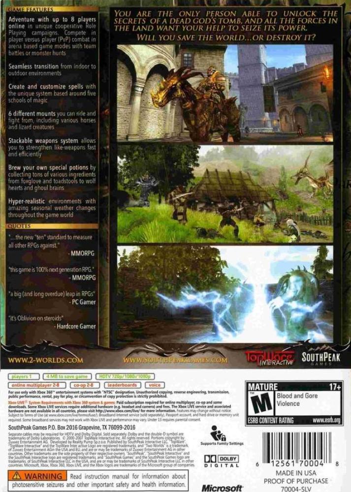 Two Worlds combines the dynamic combat system with freedom of exploration to deliver a game in which players have a real chance to shape the game world with their actions - to an extent that has yet to seen in other productions. This premise is supported with a strong, non-linear storyline and stunning combat sequences. The world comes to life as it immediately reacts to the player's actions and changes accordingly - offering new and exciting challenges.