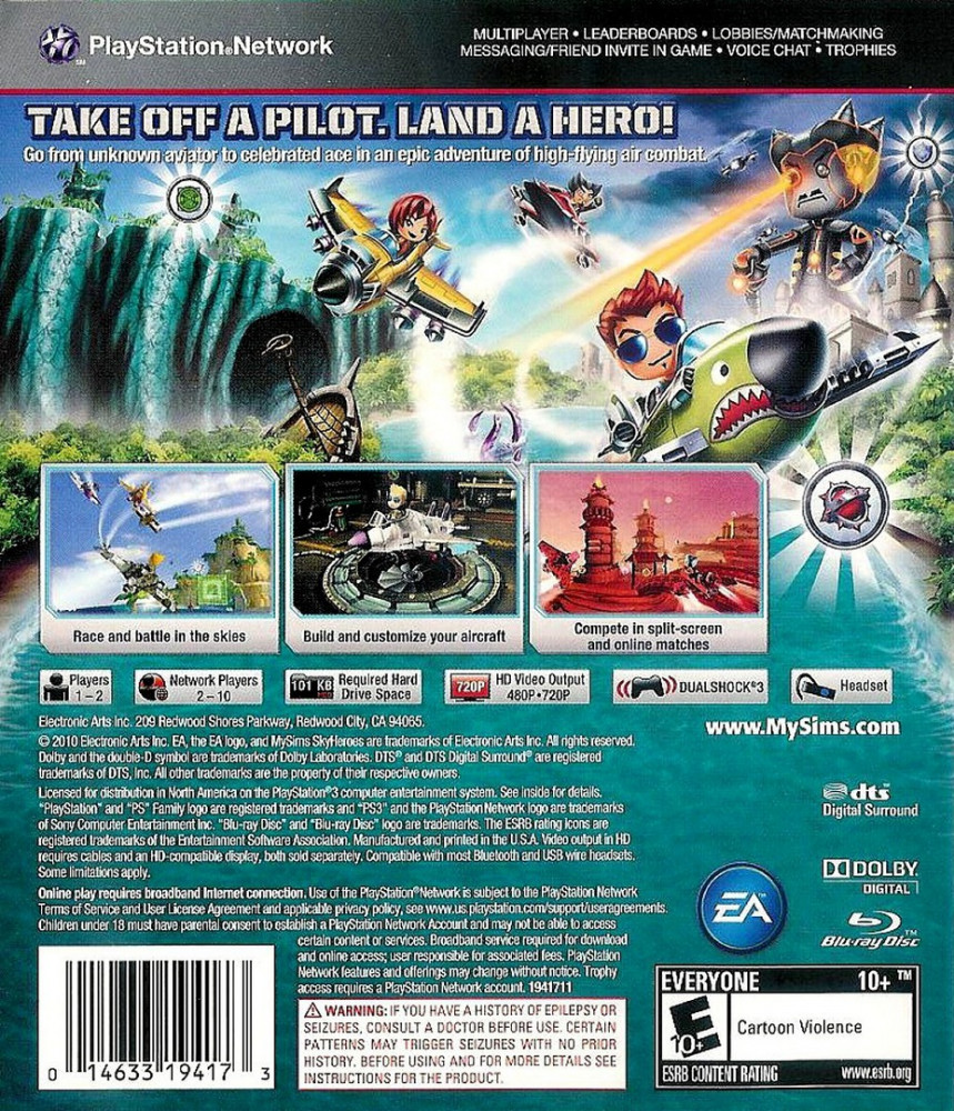 MySims SkyHeroes is an aviation game that features a solo campaign, boss battles, local co-op, and online multiplayer. There are upgrades for the planes through a plane editor which will allow players to customize a plane using parts like wings and engines acquired by completing missions.