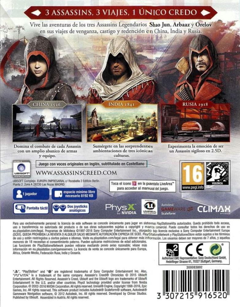 A thrilling new saga in the Assassins Creed Universe, Assassins Creed Chronicles take players to three distinct civilizations and time periods throughout history: the start of the Ming Dynasty crumble, the Sikh Empire going at war in India and the aftermath of Red October revolution.