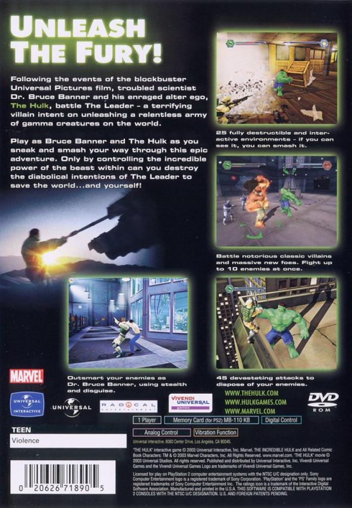 The Hulk takes place one year after the events in the film, with troubled scientist Bruce Banner and his enraged alter ego, The Hulk, forced into action once again. A new villain, known as The Leader, plans to use The Hulk's gamma energy to unleash a relentless army of gamma creatures on the world, and only you can stop him. Employ the powers of stealth and logic as Bruce Banner, or command the incredible strength and fury of The Hulk. Take down your foes in fully destructible environments. The Hulk's 25 attacks can hurt your foes and can also destroy your environment.