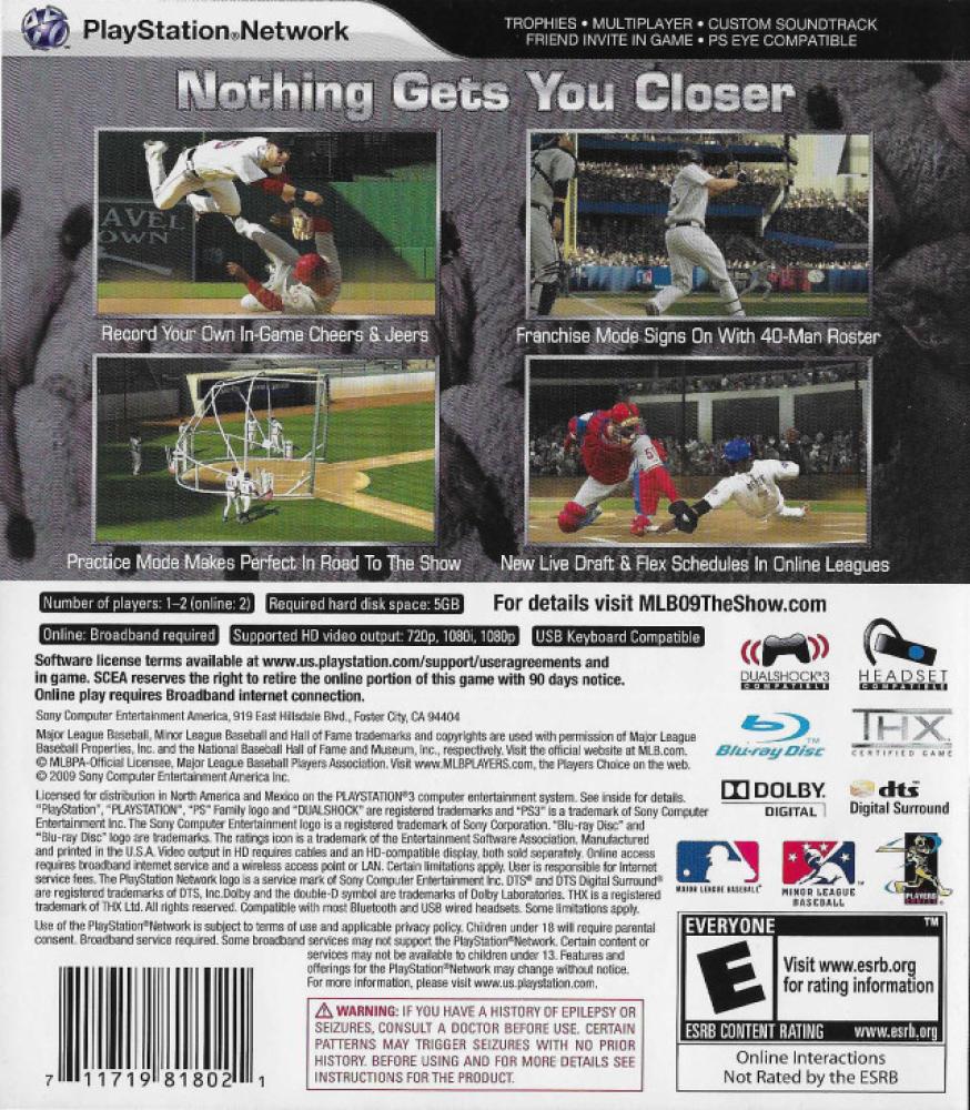 Road to the Show 3.0. Now includes interactive training, new settings, a new steal/lead-off system, presentations and coach interactions. Interactive training will consist of a set of mini-games designed to improve a player's ability and performance in various areas of baseball. Franchise Mode 2.0. Improvements include the long awaited 40-man roster! The latest Franchise Mode improvements will also offer Salary Arbitration, Waiver Transactions and September call-ups. Training/Practice Drills. In MLB 09 users will have the ability to choose from a number of different Training/Practice drills. The drills will be of various concentrations of the game. These drills are a perfect way to polish and improve your baseball skills in The Show. Details & Subtleties. Details and subtleties play a huge role in legitimizing a game and helping you lose yourself in the suspension of disbelief. MLB 09 The Show sinks it's teeth into the details with realistic stadiums and signage, wear and tear on field, dusk to night lighting transitions, stadium Jumbotron animations and even crowd atmosphere-reaching up for foul balls out of play and home runs in addition to crowd rivalries and weather appropriate clothing.