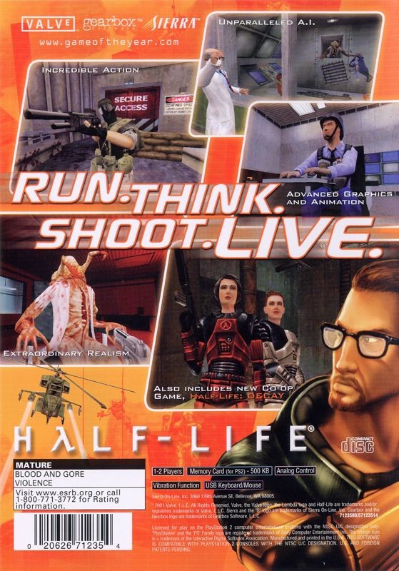 Deep in the bowels of the Black Mesa Federal Research Facility, a decommissioned missile base, a top-secret experiment goes terribly wrong. As aliens come through the walls and a military death squad shoots everything in sight, young research associate Gordon Freeman must scramble to stay alive. Find your way through the monster-ridden areas of Black Mesa using your wits, limited security clearance, and a variety of weapons, ranging from a crowbar and pistols to a rocket launcher and grenades. With split-screen deathmatch and its exclusive "Decay" single-player and multiplayer cooperative modes, Half-Life is an action experience like no other.