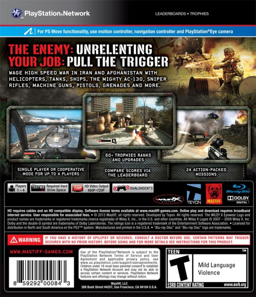 Wage high speed war in Iran and Afghanistan with helicopters, tanks, ships, the mighty AC-130, sniper rifles, machine guns, pistols, grenades and more. Single player or cooperative mode for up to 4 players. 60+ Achievements, ranks, and upgrades. Compare scores via the leaderboard. 24 action-packed missions.