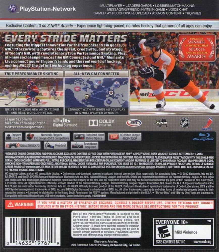 Featuring the biggest innovation for the franchise in six years, NHL 13 will deliver a revamped gameplay experience that accurately captures the speed, creativity and strategy of today's NHL headlined by all-new True Performance Skating, and supported by EA SPORTS Hockey I.Q. NHL 13 will also deliver new experiences that connect hockey fans to their friends and the real world of hockey with the all-new GM Connected and NHL Moments Live game modes. With core gameplay innovation, connected experiences, and the deepest feature set ever in an EA SPORTS NHL title, NHL 13 is truly the definitive hockey experience.