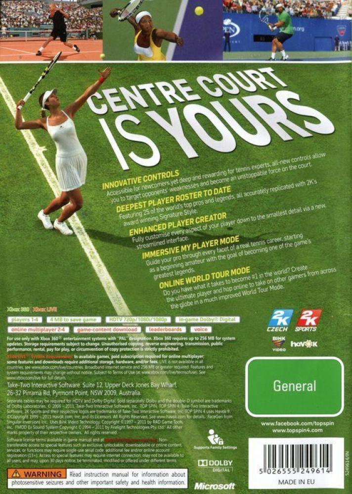 The latest iteration from the best-selling, next-gen tennis simulation video game franchise*, Top Spin 4 introduces a bold new take on the sport of tennis allowing you to experience firsthand all of the intensity, emotion, and excitement of a real life tennis match. Feel the adrenaline pumping through your veins as the crowd falls completely silent in anticipation of a break point serve. Your hands are sweating. Your heartbeat is racing. The ball is served ferociously and now coming at you at 125 mph. Intensely focused, you crush your return for a baseline winner as the sold out crowd erupts in a roar. With all-new unbelievably responsive controls, electrifying stadium atmospheres, enhanced TV style presentation elements, incredibly accurate player models with Signature, and a super deep career mode, Top Spin 4 is so real you have experience it to believe it.