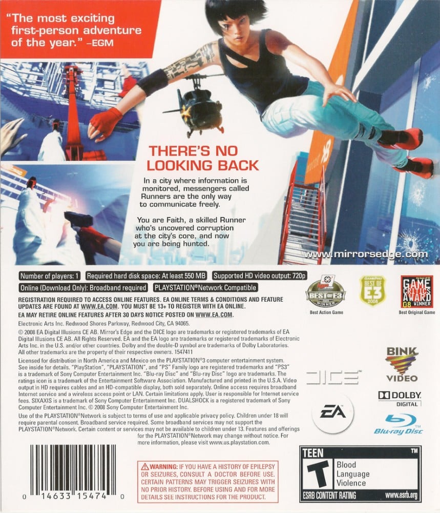 In a city where information is heavily monitored, agile couriers called runners transport sensitive data away from prying eyes. In this seemingly utopian paradise, a crime has been committed, your sister has been framed and now you are being hunted. You are a runner called faith - and this innovative first-person action-adventure is your story. Flow is what keeps you running, what keeps you alive. Mirror's Edge delivers you straight into the shoes of this unique heroine as she traverses the vertigo-inducing cityscape, engaging in intense combat and fast paced chases. With a never before seen sense of movement and perspective, you will be drawn into Faith's world. A world that is visceral, immediate, and very dangerous. Live or die? Soar or plummet? One thing is certain: in this city you will learn how to run.