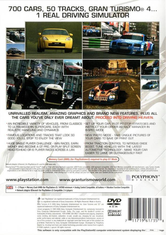 characteristics of each car take into account weight, speed, friction, and more to deliver realistic handling. Test-drive new vehicles in courses located in various sites, such as Nurburgring Nordschleife, New York City, the Grand Canyon, and Tsukuba Circuit. Along with Career mode, Gran Turismo 4 highlights the new GT Photo mode and GT Online mode, which lets players around the world compete over the Internet.