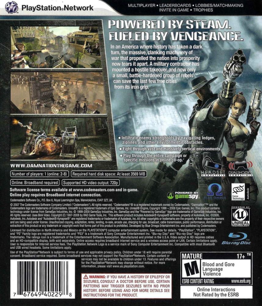 Evolving the shooter genre with its unique and exhilarating combination of fluid action and combat, Damnation will feature huge, open environments, frenetic combat, daredevil acrobatics, and high-octane vehicle-based stunts. Presenting players with an intense test of reflexes, quick thinking, and rapid-fire conflict, Damnation will feature vast, breathtaking landscapes, each covering miles of distance and thousands of vertical feet.