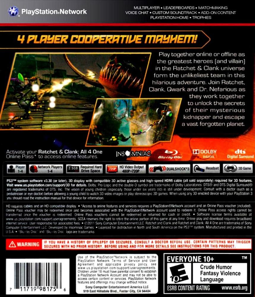 We find our heroes in the midst of a dilemma of intergalactic proportions when Dr. Nefarious' latest evil plan goes awry leaving Ratchet, Clank, Qwark and Nefarious himself caught in the snare of a powerful and mysterious machine. Begrudgingly, the Galaxy's biggest do-gooders and its most sinister criminal must work together to discover a means of escape in this action-packed installment of the Ratchet & Clank series.