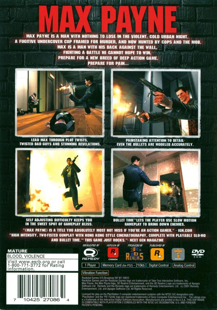 Max Payne is a man with nothing to lose--a fugitive undercover cop framed for murder, and now hunted by the cops and the mob. As Payne, you'll uncover plot twists, engage in dramatic "bullet-time" firefights with thugs, and fight your way through an unforgiving New York blizzard. Max can wield a variety of weapons including pistols, submachine guns, shotguns, sniper rifles, grenades, and Molotov cocktails. Prepare yourself for an involving story combined with slick action.