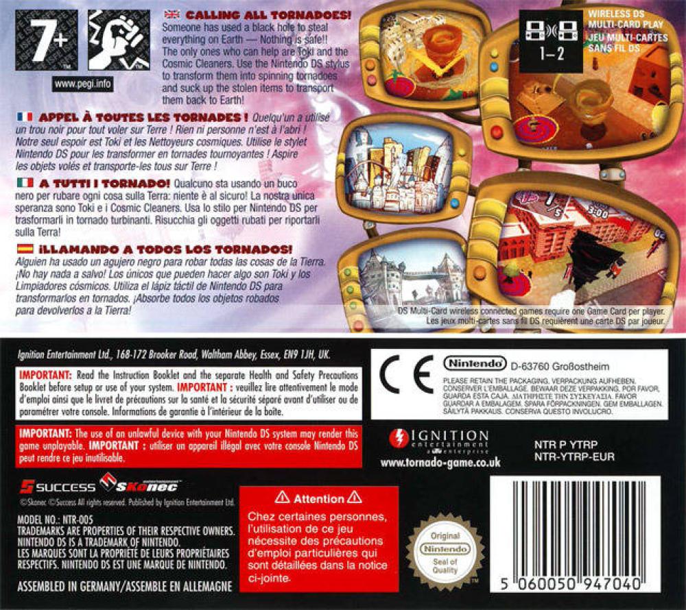 Tornado lets players join forces with Toki and the other members of the Cosmic Cleaners as they set out to restore all of Earth's buildings, vehicles, inhabitants and other obscure objects that have been stolen by the envious Prince using his mischievous "Black Hole Device." Using a combination of stylus and microphone activated controls, players will travel across Planet 69 as they level up and max out their "Tornado Machines" to literally uproot everything in their paths in effort to take back what Prince has wrongfully stolen and return it to Earth.