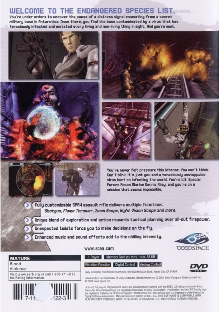 As a Marines Special Forces Recon operative, you respond to a distress signal sent from a secret military base in Antarctica. Upon entry, you learn that a rampaging virus has mutated all life within the base, and nothing is safe from its toxic grasp. Although equipped with an assault rifle that has many shot variations, you'll need more than just firepower to survive. With limited resources and few means to stay warm in the below-zero frigid environments, you'll have to withstand an onslaught of weather and creature assaults in an attempt to unravel what mysteries lie at the heart of this threat.