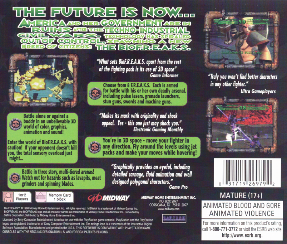 The future is now... America and her government are in ruins after the Techno-Industrial civil wars. Technology has spiraled out of control, spawning a new breed of citizens: the BIOF.R.E.A.K.S. Choose from 8 F.R.E.A.K.S. Each is armed for battle with his or her own arsenal, including pulse lasers, grenade launchers, stun guns, swords and machine guns. Battle in three-story, multi-tiered arenas! Watch out for hazards such as lava pits, meat grinders and spinning blades.