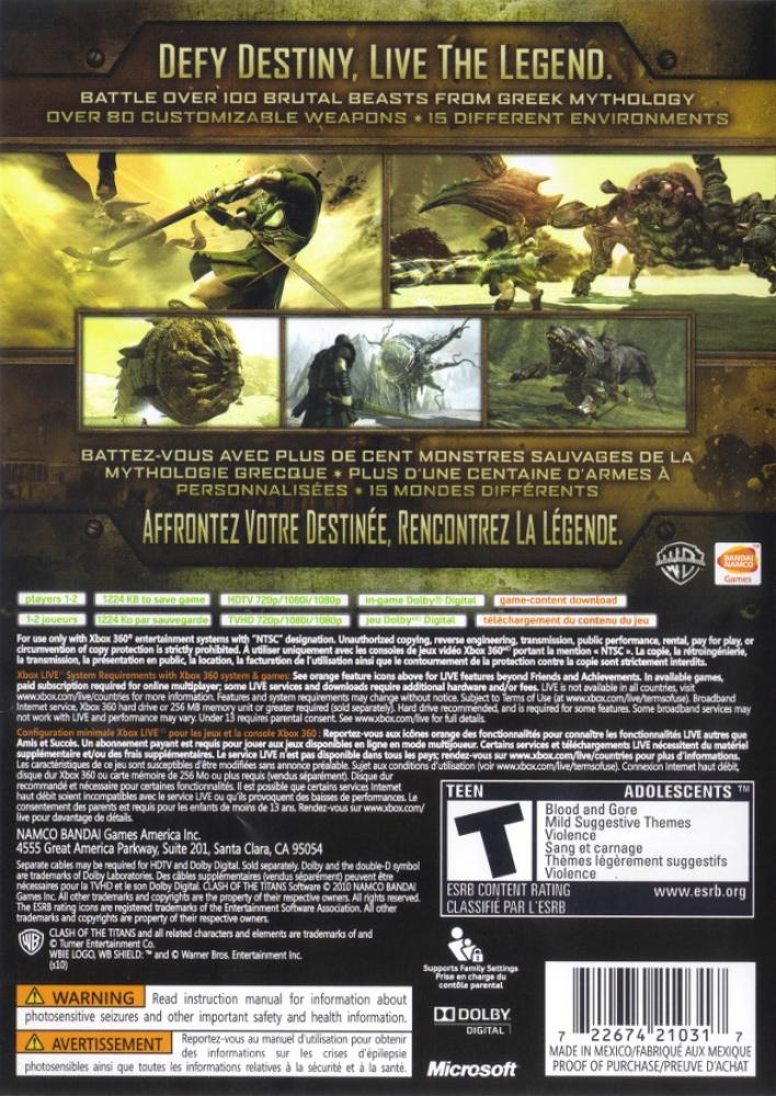 Set in the timeless grandeur of Greek mythology, Clash of the Titans immerses players into the epic battle for dominance between the human race and the powerful gods Hades and Zeus. Through vast landscapes of swamps, mountains and the underworld, two modes of play let players embody Perseus' adventure from the film, or take on original new bosses in fresh, dynamic adaptations of one of the greatest mythological stories ever told.